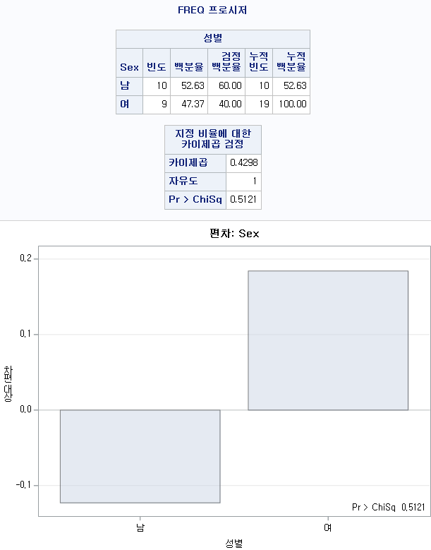 카이제곱 검정 결과 p 값이 0.5121로 유의수준 0.05 하에서 귀무가설을 기각할 수 없다. 전체 빈도 수가 19로 적긴 하지만 각 그룹의 빈도가 5보다 크므로 그냥 넘어가기로 한다. 그러므로 성별 비율은 기존에 알려진 남성=60%, 여성=40%가 맞다는 결론을 얻을 수 있다.