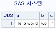 | data a; a='Hello world'; b='wo'; c=INDEX(a,b); run; proc print data=a; run; |